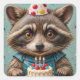 An adorable racoon with a party hat and birthday cake fantasy fairy tale art