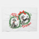 Adorable Retro Christmas Poodles Wreath Custom Kitchen Towel. Two adorable Grey/Black Poodles! Each Poodle is wearing a red collar with a bell on it, and is framed up with a pretty Holly Christmas Wreath and Merry Christmas text design. Add custom text on any white area if desired, using your choice of text(including type, size, colour, placement). Fully customisable.