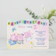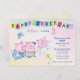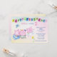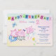 This is a cute invitation for a toddler or baby's birthday party. It features three adorable little pigs dancing a birthday jig. A blue butterfly flits around beside them, and a yellow flower grows at the bottom. Above the images is a colourful banner that says "Happy Birthday!" Your custom text is in blue and pink above and at the right. Everything is placed on a pretty pastel gradient background. The back of the invitation has the same background, with a cute bird image, and an extra text field for directions or other information. Easy to customise!