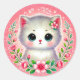 Adorable White Kitten Surrounded by Pink Flowers Classic Round Sticker