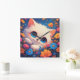 A fluffy white kitten with striking blue eyes peeks through a vibrant bed of orange, pink, and blue flowers. Playful, dreamy mood, perfect for cozy, joyful brand visuals and family themes.