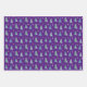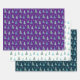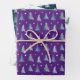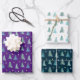 Set of green, purple and white Christmas wrapping papers, adorned with a repeating pattern of minimalist green trees and delicate stars.