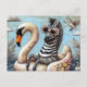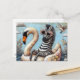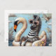 AI generated funny cute adorable zebra in sunglasses enjoys floating on an inflatable swan as a real swan gets ready to land in the background