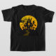 Halloween image on a t-shirt of a scary haunted house and a witch.