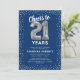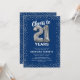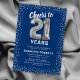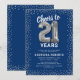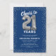 Elegant twenty-first birthday party invitation featuring a trendy blue background that can be changed to any colour, silver sparkly glitter, twenty one silver hellium balloons, and a modern 21st birthday celebration text template that is easy to personalise.