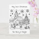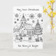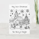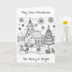 A personalized Christmas card with a coloring page of kids ice skating in front of a church surrounded by Christmas trees and snowflakes.