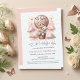 Captivating "Let the Adventure Begin" themed baby shower invitation with an adorable orange tabby kitten holding a teddy bear on a hot air balloon ride in pink clouds and surrounding gold stars in blush pink watercolors. White star pattern on blush pink on the back of invite. Templates provided.