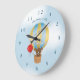 Cute and whimsical wall clock for a nursery room featuring an illustration of a brown teddy bear riding a blue and yellow hot air balloon holding a red balloon. There is faux silver glitter flags around the hot air balloon. The text above says "adventure awaits."