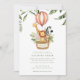 Celebrate a sweet new beginning with this Adventure Awaits safari baby shower invitation, featuring a charming storybook watercolor illustration of safari animals floating in a hot air balloon. A gentle lion, giraffe, elephant, zebra, and playful monkey are nestled together in a woven basket, surrounded by soft greenery for a warm and whimsical look.