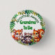 Adventure Awaits. Grandma to be baby shower button with a Woodland Creatures theme with cute racoon, squirrel and fox in a cute cartoon style surrounded by magical woods and fern foliage.