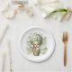 "Adventure Awaits" themed baby shower paper plates with an adorable white and tan puppy holding a teddy bear riding in a green hot air balloon. The watercolor green sky has white clouds with surrounding gold stars. Template included.
