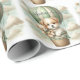 "Adventure Awaits" themed baby shower wrapping paper with an adorable white and tan puppy holding a teddy bear riding in a green hot air balloon. The watercolor green sky has white clouds with surrounding gold stars.