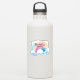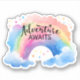 Adventure Awaits black typography and arrow on a rainbow background. Bold colours of pink, blue, yellow, green and purple with two fluffy white clouds and a sprinkling of stars.