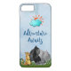 A phone case which says adventure awaits. Set on a light blue watercolor background. A blue cloud and an orange sun sit in the sky. A meerkat, gorilla and hippo all together on some savannah grasses, about to embark on some adventure.