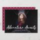 Trendy graduation announcements featuring the graduate's horizontal photo with "Adventure Awaits" in white handwritten script lettering. Personalise the front of the Adventure Awaits graduation announcements by adding the graduate's name, school name, and graduation year. The announcement reverses to display an elegant burgundy and white trellis pattern.