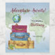 Suitcases in a watercolor effect are stacked and ready for the big move on this bottle label. A globe sits on top of the suitcases against a watercolor map in greens and blues. Make a statement with at a farewell party of any kind, whether it's an international move, retirement, sabbatical, or world travel. Available with matching products.