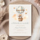 This cute baby shower invitation features a sweet watercolor teddy bear in a blue and white striped hot air balloon, above the words "Adventure awaits!" in dusty blue retro script. Personalise the text with the name of the mum-to-be in script and the details in sans serif font on a beige background.