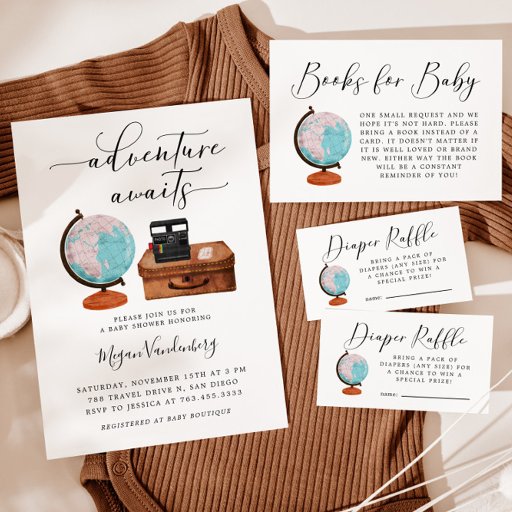 Rustic travel theme gender neutral baby shower paper plate featuring illustration of a vintage suitcase, camera, and globe. The text says "adventure awaits."