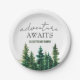 Watercolor rustic pine forest "adventure awaits" baby shower paper plates.
