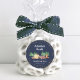 Cute stickers for your baby shower favours and correspondence featuring an illustration of woodland animals with their tent camping in the mountains and forest, an overlay of gold stars, and "Adventure Awaits" and the mother-to-be's name in white script against a midnight blue background.