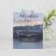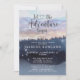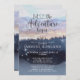 A forest theme adventure begins blue baby shower invitation with a pretty forest landscape, tree line and twinkling stars. Rustic and serene.