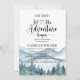 Let the adventure begin themed watercolor baby shower invitation with forest and mountains wilderness landscape with calligraphy script typography with heart in the middle.