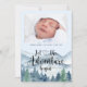 Let the adventure begin themed watercolor baby birth announcement, with forest and mountains wilderness landscape with calligraphy script typography with heart in the middle. Simply add your new baby's photo.