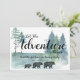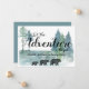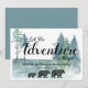 Adventure awaits, rustic woodland bears pregnancy announcement, featuring walking bear family, and a watercolor forest in green and blue hues. Rustic woodlands style.