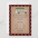 "The Adventure Begins" theme wedding for outdoorsy couple featuring wood panelled suv decorated with floral greenery and tin cans with canoe on top. Cardstock inspired background with red and black lumberjack buffalo plaid border and reverse.