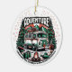 Celebrate the holidays in the great outdoors with this vibrant retro-style Adventure Camper Van ornament. Featuring a classic camper van adorned with Christmas lights, a wreath, and camping gear, this festive design is set against a backdrop of snowy mountains and lush decorated trees. A cosy campfire and camping essentials like logs and an axe complete the scene, making it perfect for outdoor enthusiasts who love to embrace adventure during the holiday season. The playful lettering "ADVENTURE" stands tall at the top, while "Celebrate the Holidays in the Great Outdoors" wraps around the bottom edge.