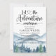 Let the adventure continue themed watercolor baby shower invitation with forest and mountains wilderness landscape with calligraphy script typography with heart in the middle.