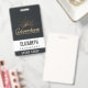 Personalised name badge with a gold coloured illustration on a black-grey background. Designed with an illustration of a mountain with the suns rays shining outward from behind. Typography says: Adventure explore dream discover.