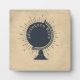 Tabletop world globe silhouette with back sunburst and "Adventure More" curved text on distressed tan background
