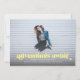 This full bleed photo graduation announcement and invitation features the words "adventures await" in light yellow. It has space for your graduate's details on the front with even more room for text on the back of the card.