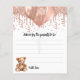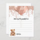 For a Baby Shower. A stylish white background. Decorated with rose gold, pink drips, paint dripping look,party streamers, balloons and a cute teddy bear.