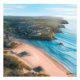 Aerial beach and town painting, was inspired by an aerial photo. Usually my paintings are quite textured, but this image inspired me to make “Soft and Dreamy Perranporth”. Smooth almost abstract in places, digital paining of Perranporth, Cornwall. Lines of blue waves meet the cliffs and tan and pink beach at sunset. Rows of houses and buildings in the town and on the cliffs. Hazy thin clouds in a blue sky,