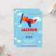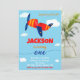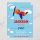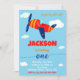 Transportation theme birthday invitation for a boy toddler's first birthday featuring aeroplane and some clouds in the blue sky around.