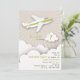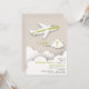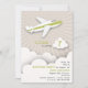 A birthday party invitation featuring an illustration of a white aeroplane with green stripe flying above the clouds. Personalise the text.