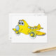 A whimsical yellow cartoon passenger aeroplane with a blue nose flying the friendly sky.