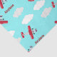 Red and grey aeroplane with text on blue background with white clouds pattern design.