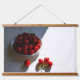 Aesthetic still life with ripe cherries on a white hanging tapestry