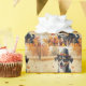 A watercolor-style painting of a cheerful dog sitting amidst a pile of vibrant fall leaves, surrounded by tiny pumpkins and scattered acorns. The dog wears a little pilgrim hat and beams with joy, capturing the spirit of Thanksgiving. In the background, soft harvest fields and golden-hued trees create a peaceful countryside ambiance. Gentle textures and warm, muted autumn tones give the scene a cosy, nostalgic feel perfect for celebrating the beauty of the season.