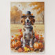 A watercolor-style painting of a cheerful dog sitting amidst a pile of vibrant fall leaves, surrounded by tiny pumpkins and scattered acorns. The dog wears a little pilgrim hat and beams with joy, capturing the spirit of Thanksgiving. In the background, soft harvest fields and golden-hued trees create a peaceful countryside ambiance. Gentle textures and warm, muted autumn tones give the scene a cosy, nostalgic feel perfect for celebrating the beauty of the season.