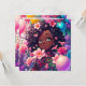 Pretty personalised birthday girl invitation. Cute graphics of a beautiful African-American anime girl with pretty pink flowers in her cute curly hair. These are cute for a teen or pre-teen girl. Colours are pink, purple, blue and yellow.
