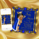 Royal blue and gold African American prince baby shower invitations with cute baby prince on a beautiful royal blue and gold jewel background. These elegant royal blue and gold prince baby shower invitations are easily customised for your event by simply adding your details.