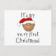 Kid style text reads "It's My Very First Christmas" and an African American baby is dressed in a Christmas stocking cap on customisable first Christmas tote bags, T-shirts, and more.
