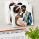 Watercolor artwork features a beautiful brown-skinned couple as bride and groom. This melanated item has a peach and coral colour scheme with floral accents.