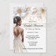 A beautiful watercolor African American / melanin woman with her back to you is looking back over her shoulder and is framed by a white background that has pretty white floral flowers on the top edge. She is wearing an exquisite white wedding gown that has lace detail on it and an open heart shaped back detail. Her hair is swept up in a stylish bun adorned with a lace white band and she is wearing drop diamond earrings to finish her elegant look off. Black templates appear to her right for your custom wording and a single horizontal white and faux gold has the name of the occasion displayed boldy on it in a calligraphy script. This design is ideal for elegant simple floral or botanical white and faux gold bridal showers. Feel free to change the background and font colour to any colour of your choice to suit your special occasion.