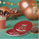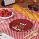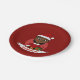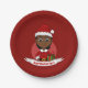 Paper plates with an illustration of a cute smiling African American girl with short black hair, the girl is wearing a Santa Claus costume with a red hat and holding a present; in a red circle on a red background, with an editable text template for your name or message