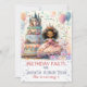 Created in a whimsical and enchanting abstract atmosphere this personalised invitantion card featuring african american cute princess girl with crown, celebratiing her birthday with castle cake, splash of confetti in beautiful pastel colours. .